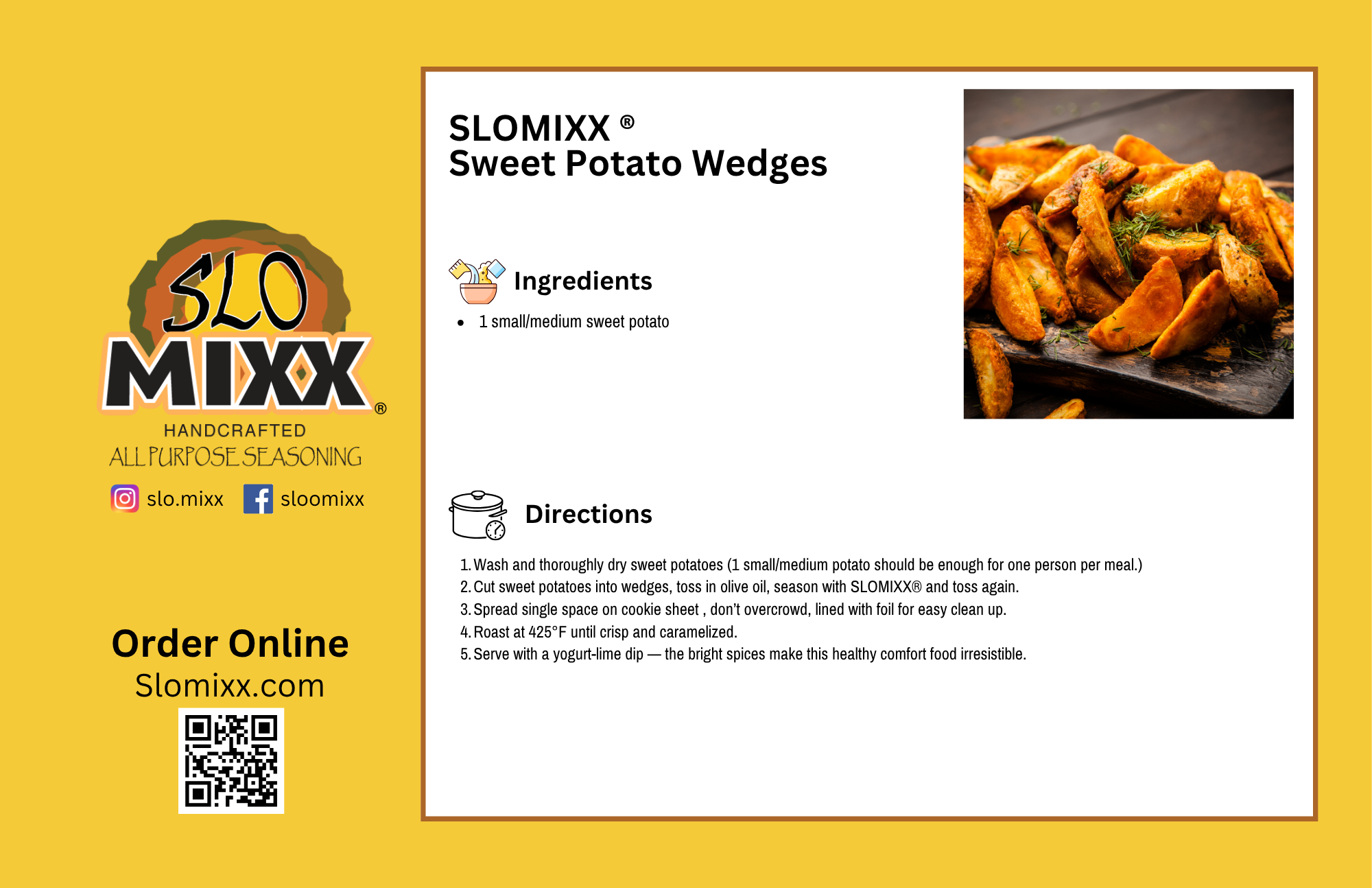 The perfect healthy comfort food. Sweet potato wedges are seasoned generously with SLOMIXX® and roasted at high heat until crisp and caramelized. The bright spices are irresistible and pair perfectly with a simple yogurt-lime dip.